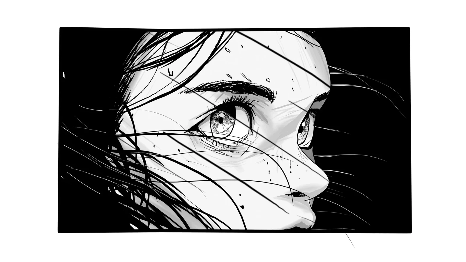 For the hair, I explored a lightweight Grease Pencil-based approach instead of rigging, using modifiers to introduce subtle motion and flow. Additional details, such as rain streaks and small facial accents, were added to support the mood without overcomplicating the scene.